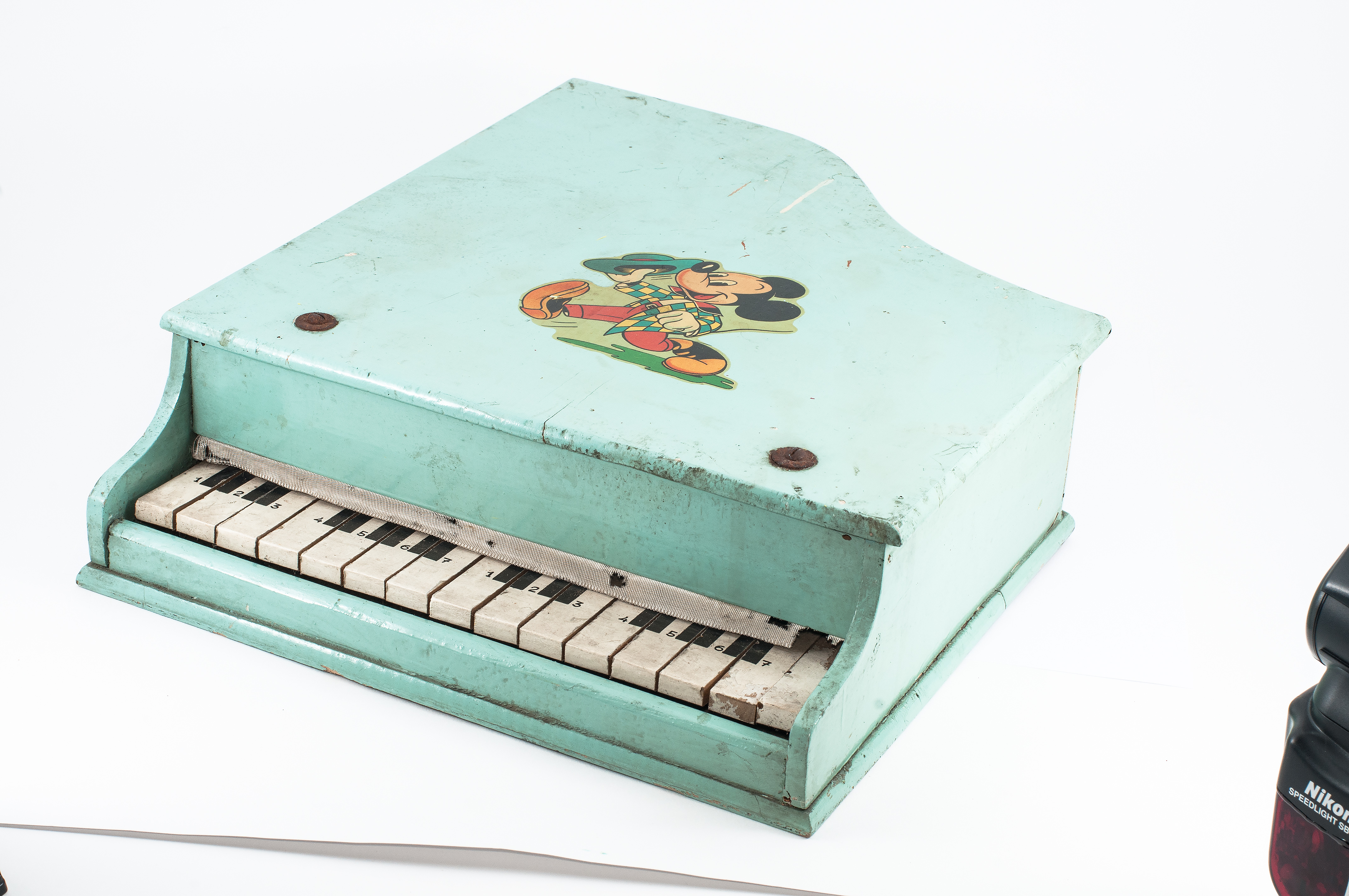 The green colored wooden miniature grand piano made in 1971. There is a photo of Mickey Mause on it. There are 15 keys with numbers on them.